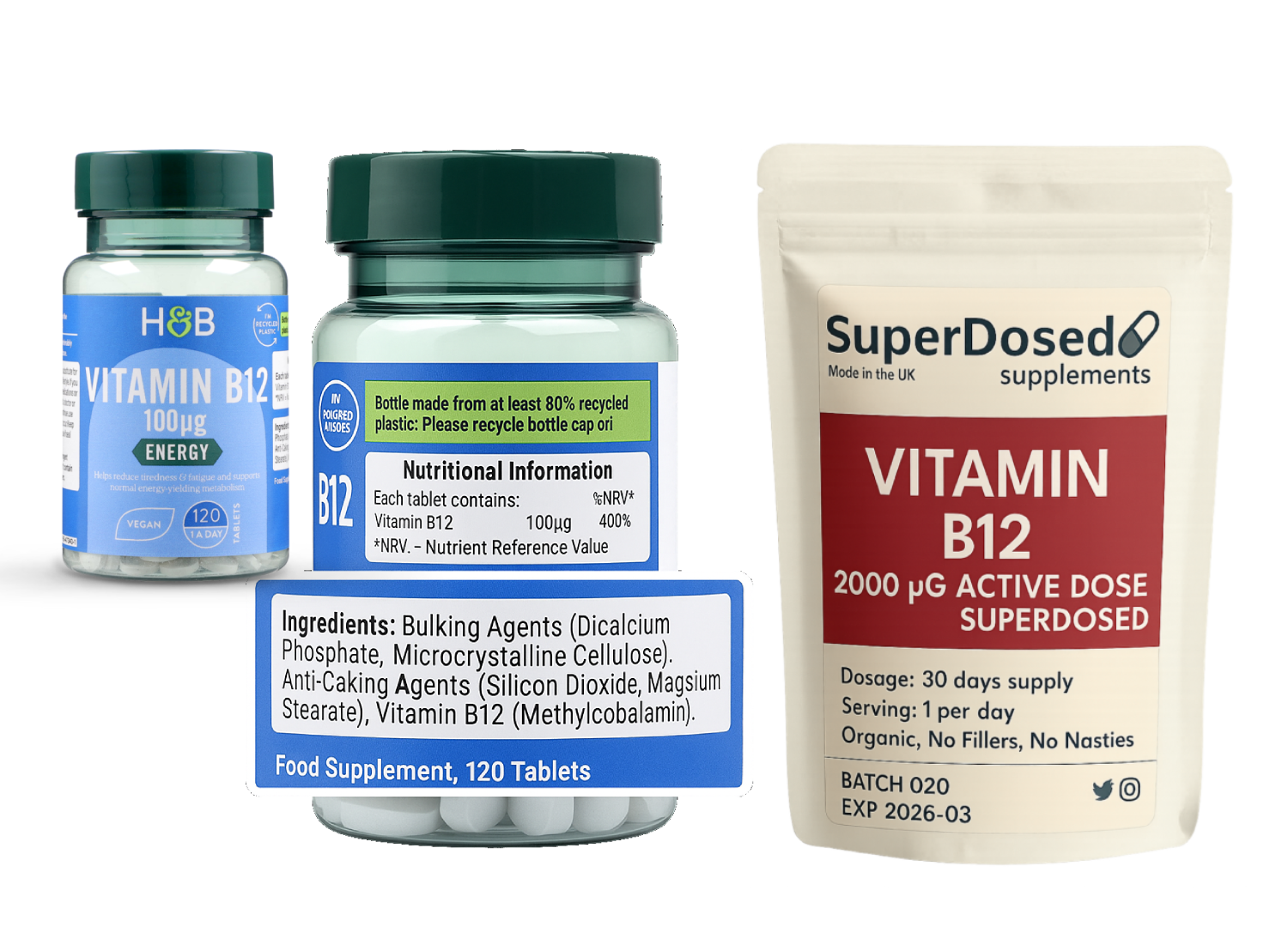 Most Vitamin B12 supplements use the cheapest, least effective form cyanocobalamin, and tiny doses that barely move the needle.